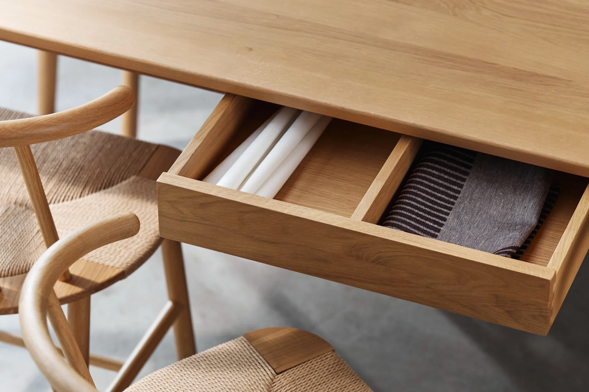 The dining tables, made of solid, high quality oak, have a functional extra feature - a built in drawer for extra storage.